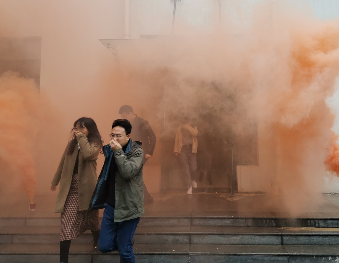 “全体师生注意,现在工科楼C座出现火情,烟雾很大,请迅速按疏散方案撤离。”上午九时三十分演习警报响起,在消防指导员的引导下师生分两批从东西两侧的通道疏散,在工科楼C座与D座间的空地集合。师生们临危不乱,整个撤离过程快而有序、效果良好。
