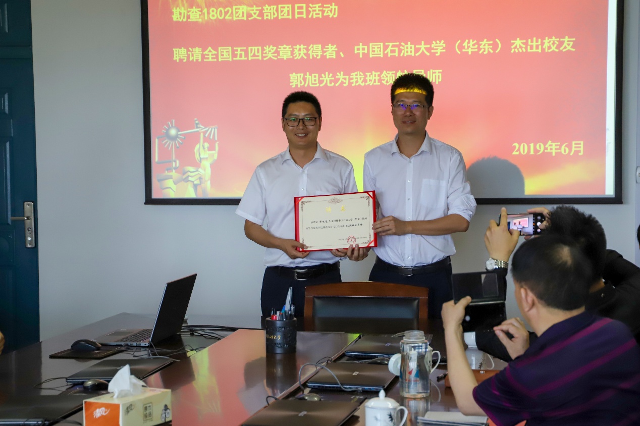 随后,校友郭旭光参加勘查技术与工程专业(物探方向)1802团支部主办的“让梦想起航”主题团日活动,他讲述了自身在石大的求学之路和奔赴新疆油田的工作感悟,“每个人的起点是不一样的,但是一定要明确定位,树立目标,做到笨鸟先飞。遇到困难时要多坚持一点,脚踏实地做事,坚定不移前行,终会守得云开见月明。”其真挚的分享和深情的寄语感染了在场的同学们,勘查1802团支部的朱晓剑激动地说道:“作为地院学子,就应该树立远大理想、勇于担当责任,我们在追求真理的过程中要敢于、勤于钻研精深学问,锤炼意志,坚持到底。”活动最后,徐永涛副书记代表学院聘请郭旭光担任勘查1802班“领航导师”。