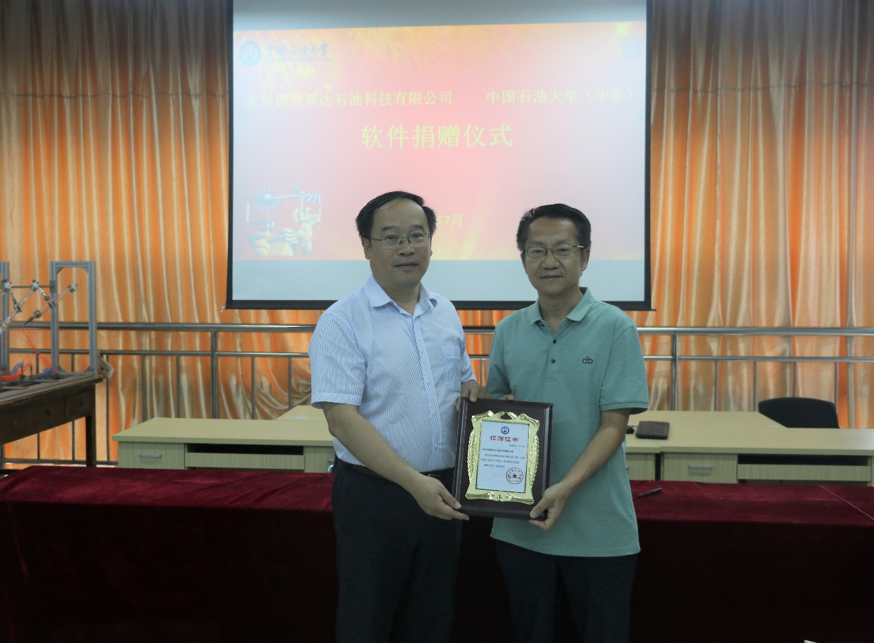 姚军代表学校向刘力辉颁发捐赠纪念牌,新葡的京集团8814院长林承焰与刘力辉共同签署了Geoscope软件捐赠协议。
