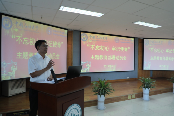 根据学院党委制定的《中共新葡的京集团8814新葡的京集团8814委员会开展“不忘初心、牢记使命”主题教育工作方案》,学院党委书记张卫东带领大家集体学习了学校“不忘初心、牢记使命”主题教育精神和工作安排,结合工作实际就学院做好“不忘初心、牢记使命”主题教育做出要求。张卫东书记强调,学院班子领导干部,要坚持以上率下,先学先改、即知即改,示范带动广大党员、干部的学习教育。各党支部要认真贯彻 “不忘初心、牢记使命”主题教育的总要求,切实意识到开展主题教育的重要意义,准确把握目标要求和工作安排,按照总书记提出的“思想认识到位,检视问题到位,整改落实到位,组织领导到位”“四个到位”要求,迅速行动扎实开展好主题教育,规定动作规范到位,自选动作创新务实,以主题教育为契机,认真查找学院党建和思想政治工作存在的深层次问题,教师队伍建设、学科建设、重大科研攻关等学院改革发展遇到的问题,提出切实可行的整改措施,扎实抓好整改,总结提炼工作经验,做好宣传报道、经验分享,力求取得实效,推进学院“双一流”建设。