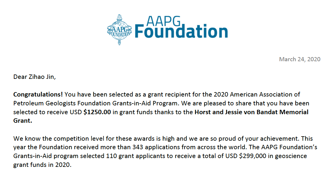 AAPG全球助研金(GIA,Grants-In-Aid)是由美国石油地质家协会(AAPG)面向全球硕士和博士研究生设立的基金资助项目,旨在促进地球科学方面的研究,为研究石油和能源矿产资源的勘探开发或相关环境地质问题的研究生提供财务资助,以支付其与论文工作直接相关的费用,例如现场工作,实验室分析等。2020年全球共有110名学生申请成功并获得资助(其中亚洲地区共18),总资助金额为$299,000。