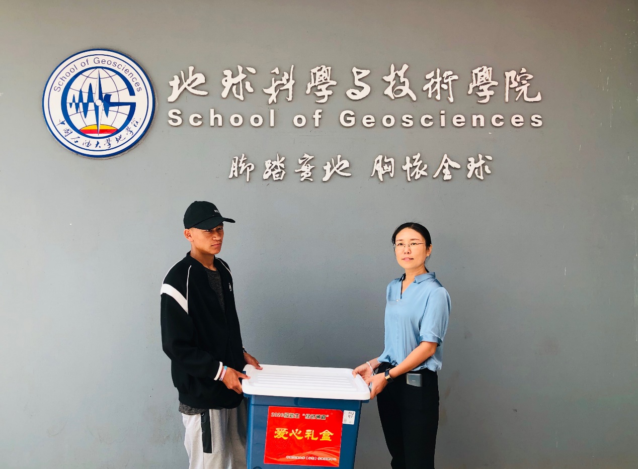 学院院长林承焰勉励新生们秉承“脚踏实地,胸怀全球”的院训,奋斗拼搏、大展宏图。党委书记刘华对新生们说道:“感谢你们选择石大,石大也将带领你们追求卓越,希望你们今天融入石大,明天为国家能源事业贡献力量!”并送给来自西藏的其美加布“爱心礼盒”。