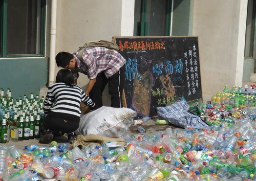 2012年春晖志愿服务队“瓶心而动”活动现场,活动通过收集和变卖学生宿舍内废弃的瓶子以及其他废旧物品筹集善款(资料图)