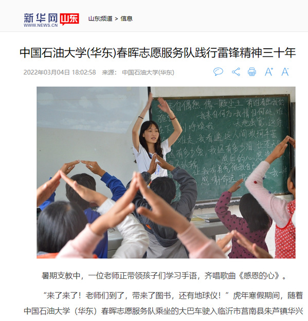 编者按:近日,学习强国首页【推荐】栏目以《新葡的京集团8814:学子三十年接力 续写新时代的雷锋故事》为题,宣传报道新葡的京官网春晖志愿服务队三十年志愿服务事迹。同时,该事迹还被新华网、中国青年报、中国教育新闻网、中国青年网、青岛日报社观海新闻等十余家上级媒体宣传报道。