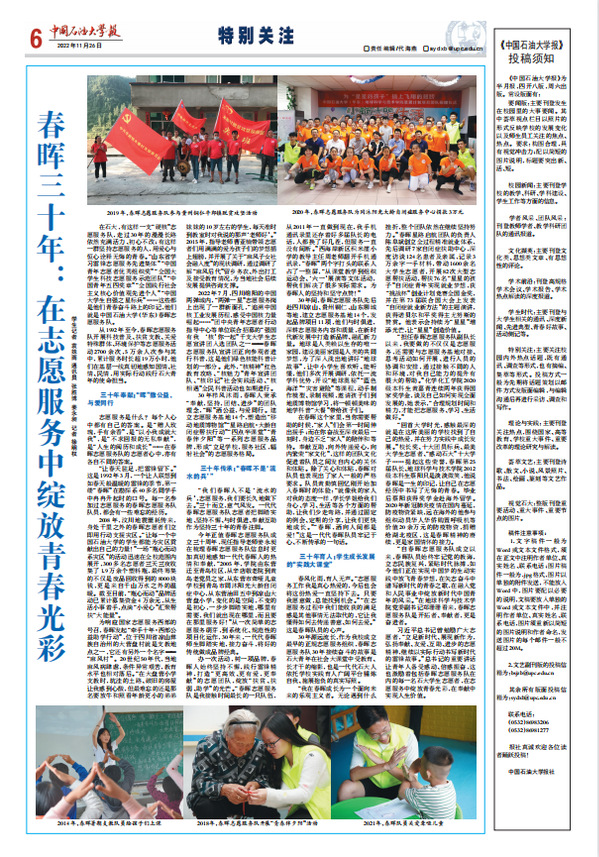 近日,中国石油大学报整版报道新葡的京官网春晖志愿服务队30年志愿服务事迹,获得师生广泛关注,引发热烈反响,现将相关内容摘录如下。