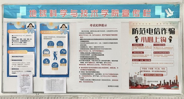 宿舍宣传栏张贴有防诈骗、预防流感等有关安全稳定内容的信息