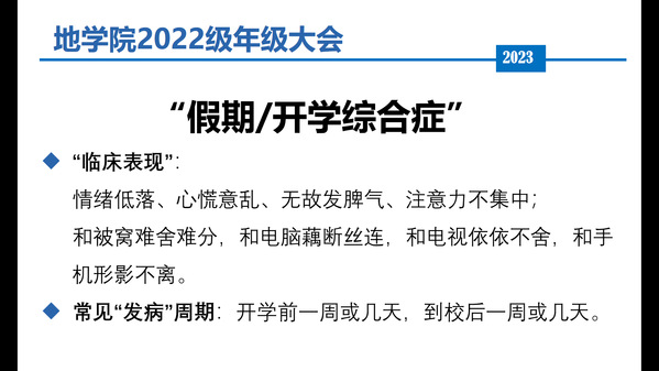 开学前,学院本科2022级召开线上年级大会,会上对学生安全问题做出重点强调。辅导员王力禾指出,在做好健康监测、顾好自身健康状况的同时,更要注意网络安全。辅导员崔景辉就学生“开学综合症”进行“病情分析”、提出“治疗方案”,提醒同学调整作息、找准学习节奏,避免出现紧张焦虑的负面情绪。