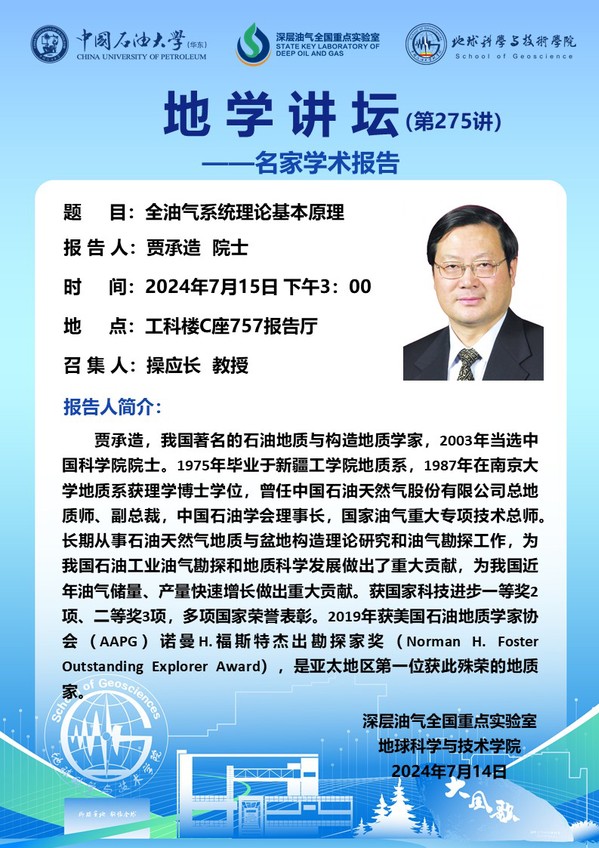 【地学讲坛第275讲】关于贾承造 院士《全油气系统理论基本原理》学术报告的通知
