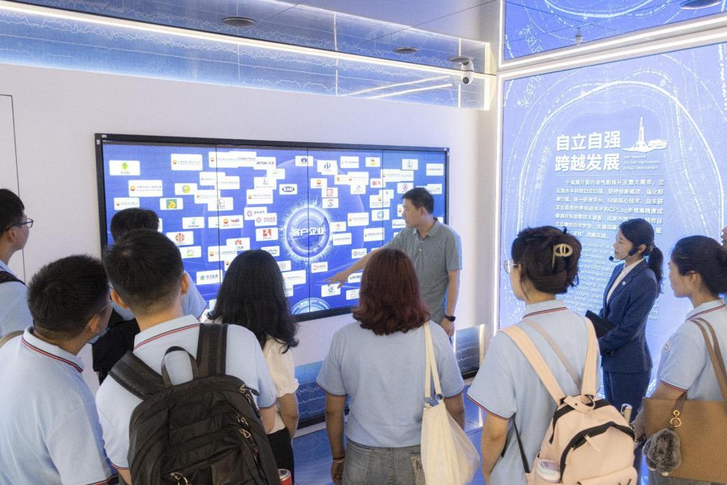 实践团来到中国石油集团测井有限公司测井展厅,在校友和讲解员的带领下实践团成员们通过史实、影像和实物了解了测井技术发展历史,感受了我国测井技术从落后到追赶、从学习引进到自主跨越的艰辛历程。实践团成员们对石油测井领域的前沿技术和科研成果有了更加深入的认识和了解,从中感受到了一代代石油地学人紧跟时代脚步,埋头苦干实干、为国找油找气,为祖国能源事业而艰苦奋斗的勘探精神。