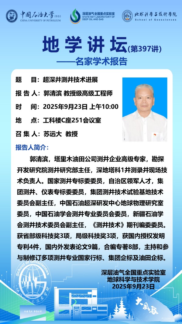 【地学讲坛第397讲】关于郭清滨教授级高级工程师《超深井测井技术进展》学术报告的通知