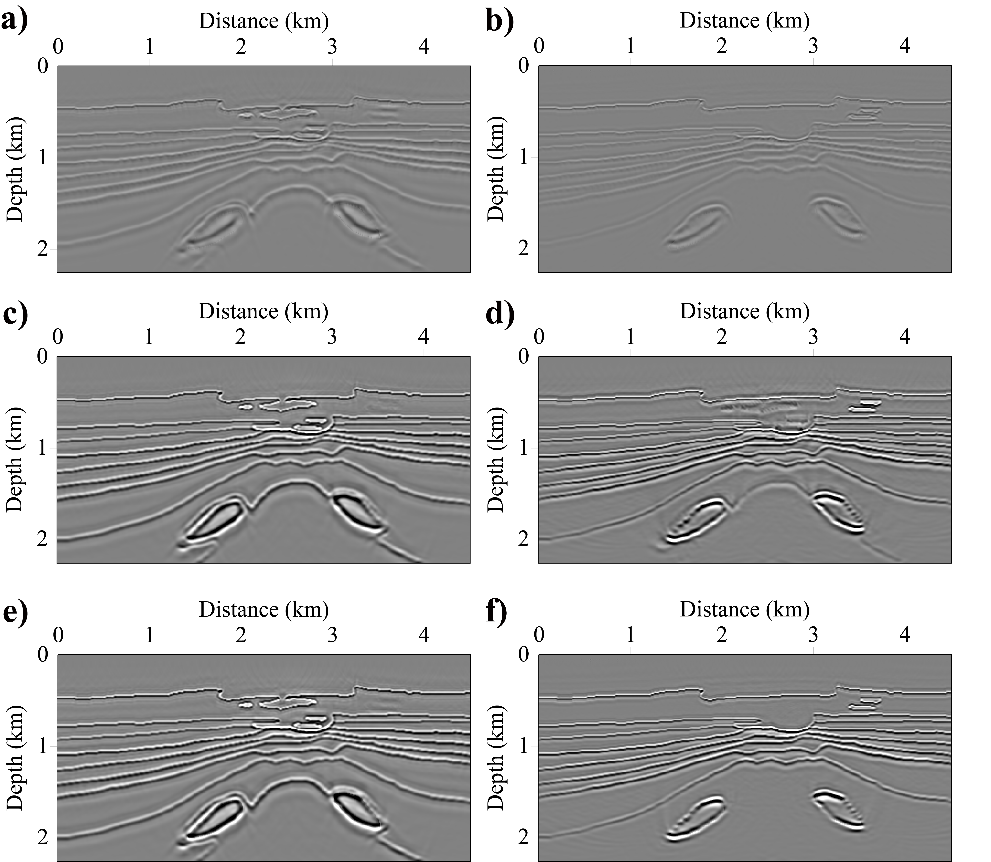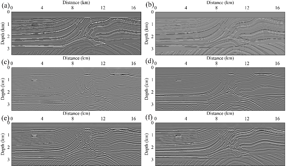 图2. 最小二乘逆时偏移成像结果:(a)波阻抗扰动(参考结果);(b)波阻抗发射率(参考结果)。散射波最小二乘逆时偏移(c)第1次迭代结果,(e)第10次迭代结果; 反射波最小二乘逆时偏移(d)第1次迭代结果(逆时偏移结果),(f)第10次迭代结果