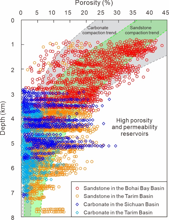 随着中浅层油气勘探逐渐成熟,深层-超深层已成为油气的重要接替领域。在深部高温、高压和高应力的条件下,深层储层仍然保持较高的孔隙度和渗透率,与传统的压实作用和岩石孔隙演化模型不符(图1)。