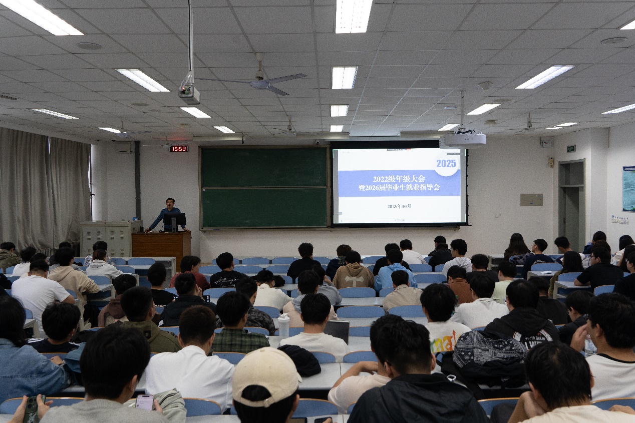 2025年10月15日下午,学院2022级在南教504与307教室举行年级大会暨2026届毕业生就业指导会。会议由辅导员王力禾主讲,辅导员谷雨帆及2022级全体学生参加。会议就学生发展前景、未来目标与路径规划、就业指导、安全教育以及日常管理等进行了交流与强调。