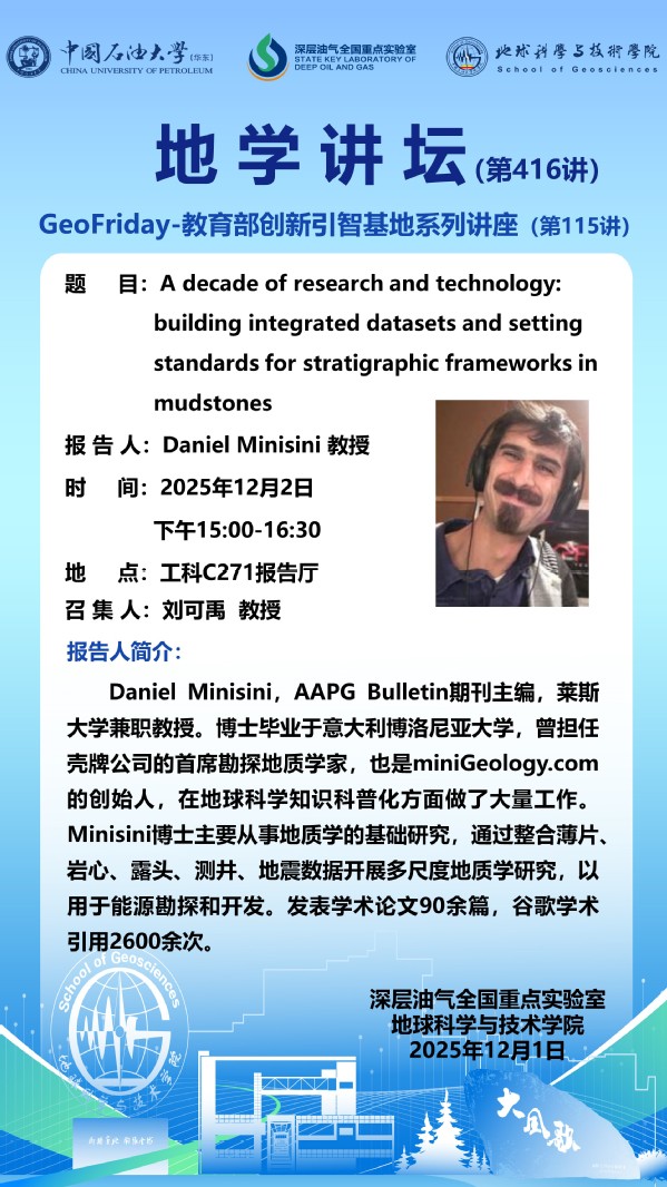【地学讲坛第416讲】关于Daniel Minisini 教授《A decade of research and technology: building integrated datasets and setting standards for stratigraphic frameworks in mudstones》学术报告的通知