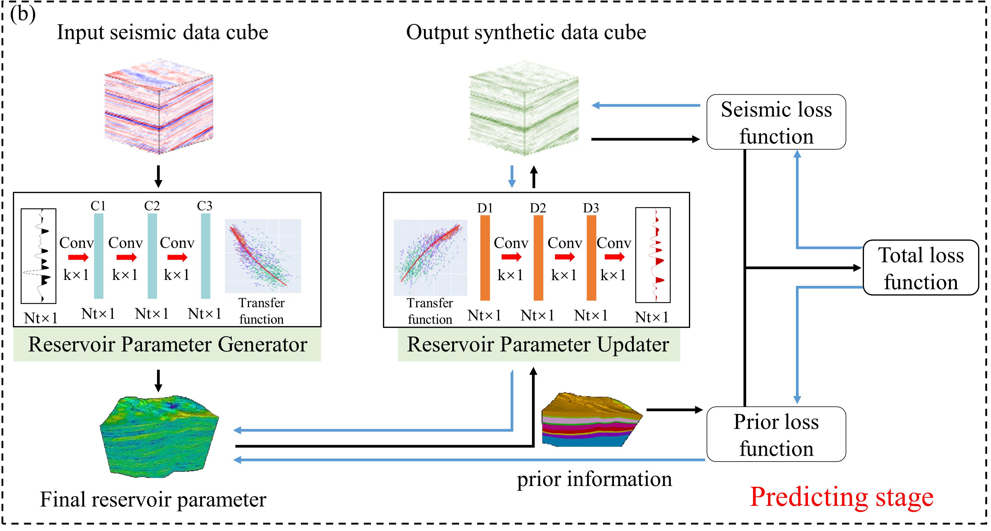 本研究针对地震反演问题的特点,提出了一种独特的知识嵌入式闭环(KECL)深度学习框架。KECL 深度学习框架由储层参数生成器(RPG)和储层参数更新器(RPU)组成。前半环是RPG,它将地震数据作为输入,生成初始储层参数。后半环为RPU,以初始参数为输入,输出合成地震数据。通过测井数据的训练,利用油田地震数据与RPU模拟的合成地震数据之间的差异来优化RPG和RPU。在这个深度学习框架中,嵌入地震卷积模型知识,以解决标签不足的问题。此外,半监督学习被用作先验信息减少反演结果的不确定性。训练完成后,在先验地质信息数据的帮助下,利用RPU更新RPG生成的初始参数,完成最终的储层参数反演。