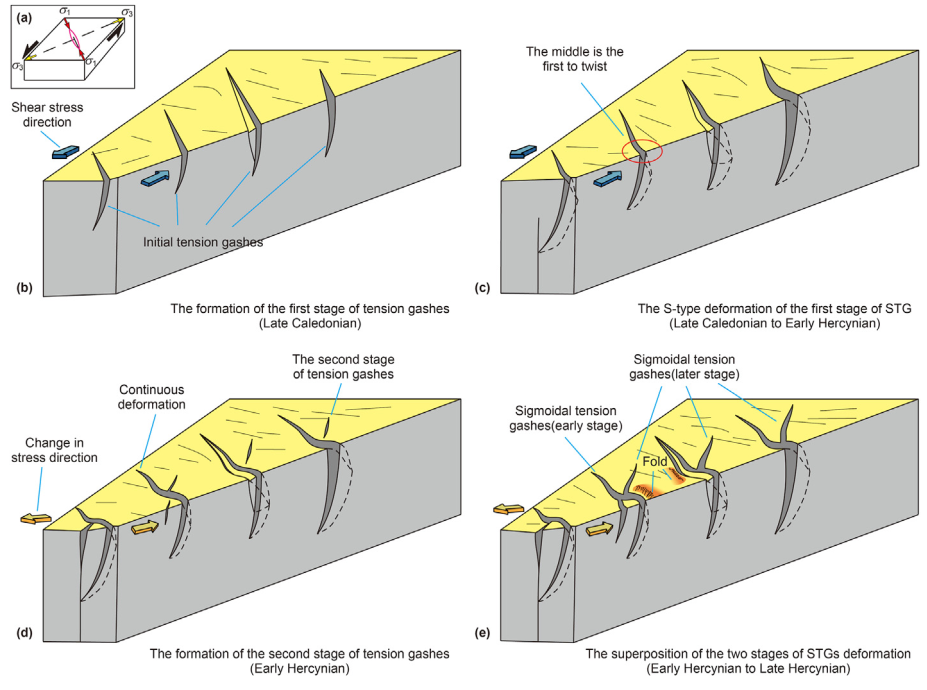 走滑断裂在地壳中非常发育,可形成多种结构类型,反映了复杂的运动学和动力学背景,控制了油气资源的分布。近年来,随着克拉通走滑断层理论和技术的发展,塔里木盆地顺托果勒低隆起引起了人们的广泛关注。受多期构造运动叠加的影响,其特殊的走滑断裂及其派生构造特征控制着该地区油气的分布。相比之下,埋藏在沉积盆地深层的走滑断层,对其运动学和形成机制研究难度大。这限制了对断裂特征和其控藏作用的探究。在该研究中,我们确定了塔里木盆地顺南地区形成的“S”型张性断裂的特征。使用高分辨率三维地震数据和属性分析来研究其几何形变特征。利用地震曲率属性计算“S”型张性断裂各点的应变值(图1)。确立了“S”型张性断裂的形成机制(图2),并在此基础上讨论了其在控制油气运移和聚集中的作用。