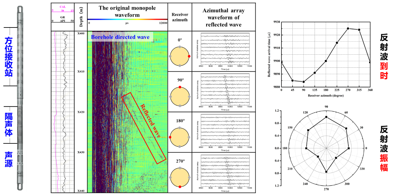 单极纵波远探测方法,最早由Hornby(1989)提出。单极辐射高频纵波的波长较小,有利于较小尺度地质散射体的探测,但声源均匀辐射不具备方位分辨能力。为此,我们提出多方位接收、采集数据,并同时利用方位反射纵波信号的到时和幅值特性唯一定位井外目标体。自主研制的方位纵波远探测仪器样机成功测到了高信噪比的地层反射纵波,且不同方位上反射信号的到时和幅度存在明显差异(实测结果详见图1),为井外地质体的三维定位提供了依据。