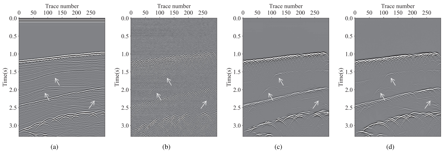 图3 Viking Graben实际数据示例 (a) 全波场数据;(b) PWD方法分离的绕射波;(c) U-Net网络分离的绕射波;(d) c-DDPM分离的绕射波