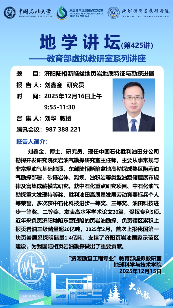 【地学讲坛第425讲】教育部虚拟教研室活动-关于刘鑫金 研究员《济阳陆相断陷盆地页岩地质特征与勘探进展》讲座的通知