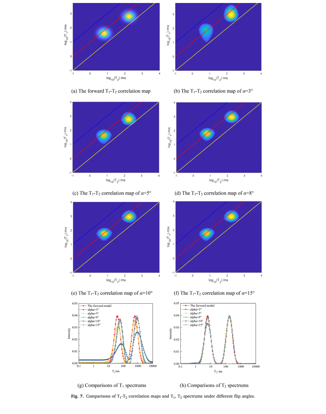 数值模拟结果表明:翻转角α对T1弛豫更敏感,而对T2弛豫影响较小;α脉冲的个数p主要影响“长T1 短T2”组分的测量;重复时间TR会显著影响“短T1 长T2”组分的恢复。在典型双组分模型条件下,当TR=0.1–1ms、α≈5°、p≈1000时,正演模型与反演结果的相关系数达0.986,且总采集时间可控制在10s甚至约5s以内,与传统的IR CPMG与SR CPMG等常规序列相比,新的采集方法在保证T1-T2二维谱精度的同时,显著提升了采集效率。
